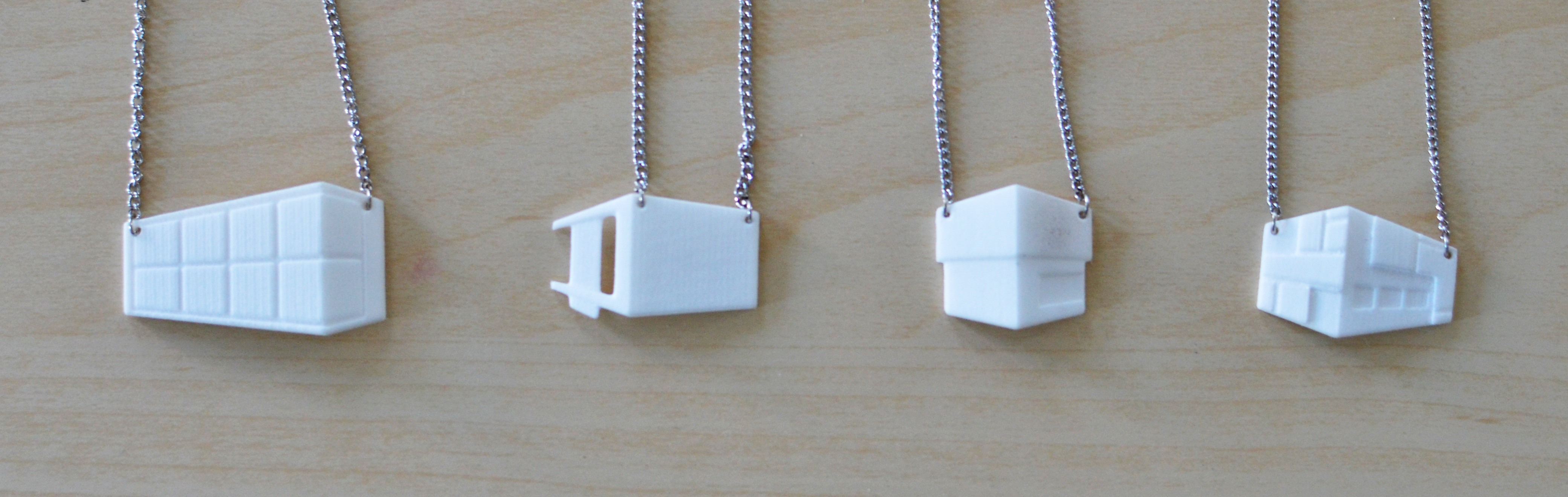 A collection of necklaces inspired by geometric architecture. 3D printed nylon.