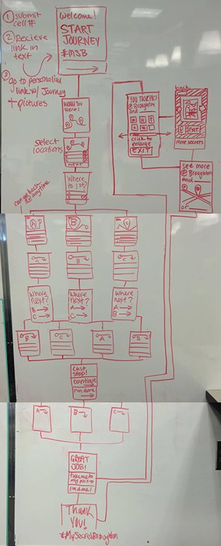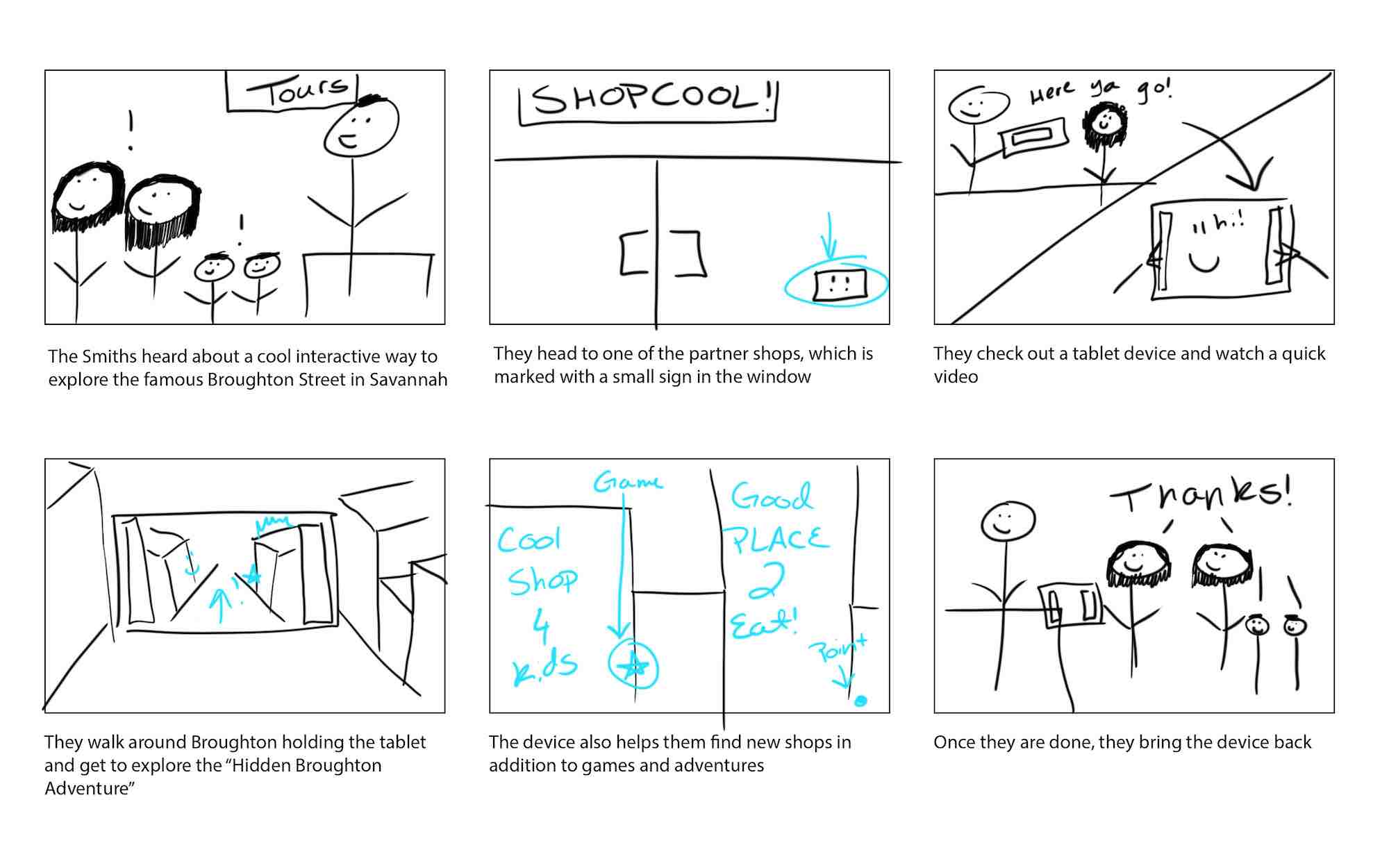 We started out with a large number of ideas, some of which included the idea of families “checking out” tablets or some other kind of portable device so they could interact with touchpoints around the street in shops and at landmarks.