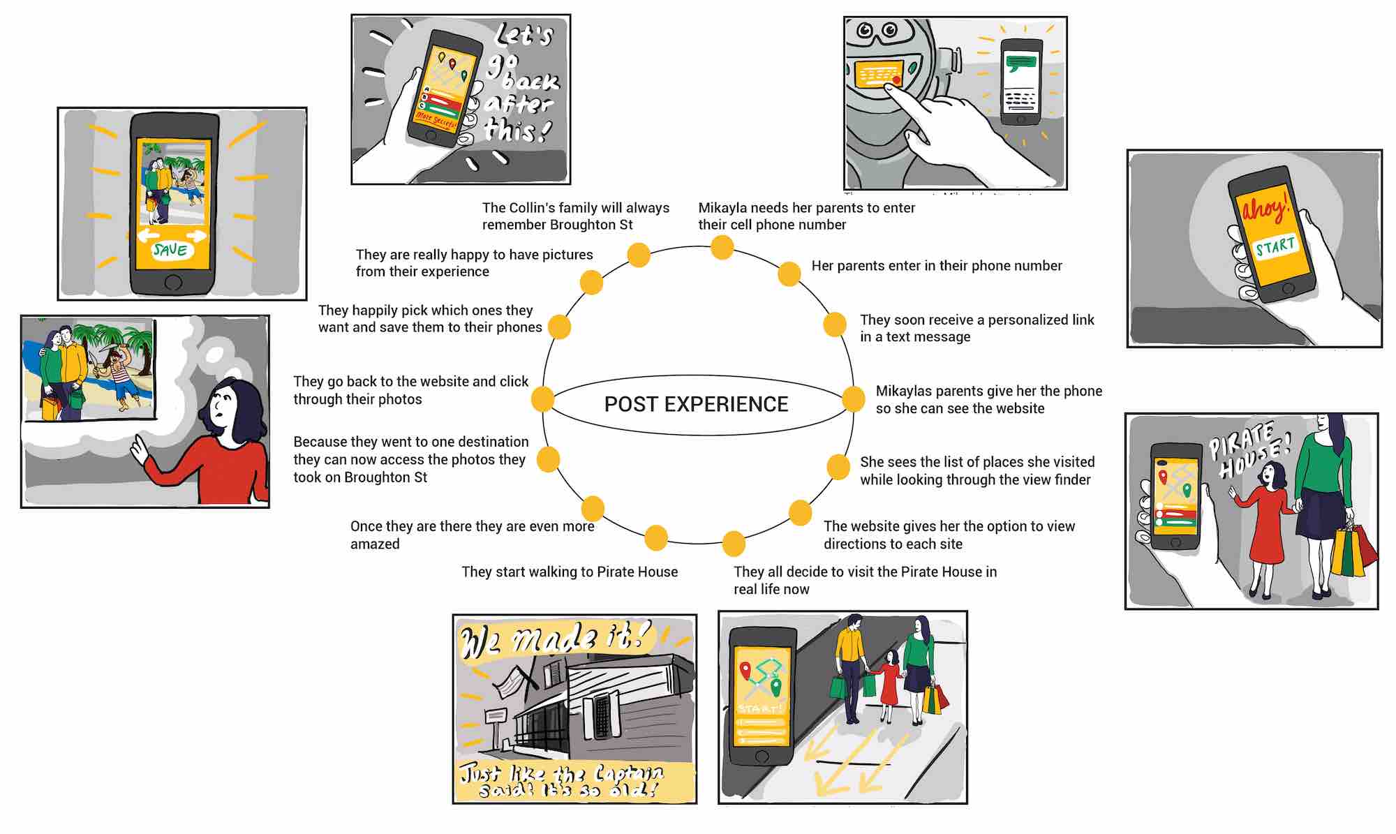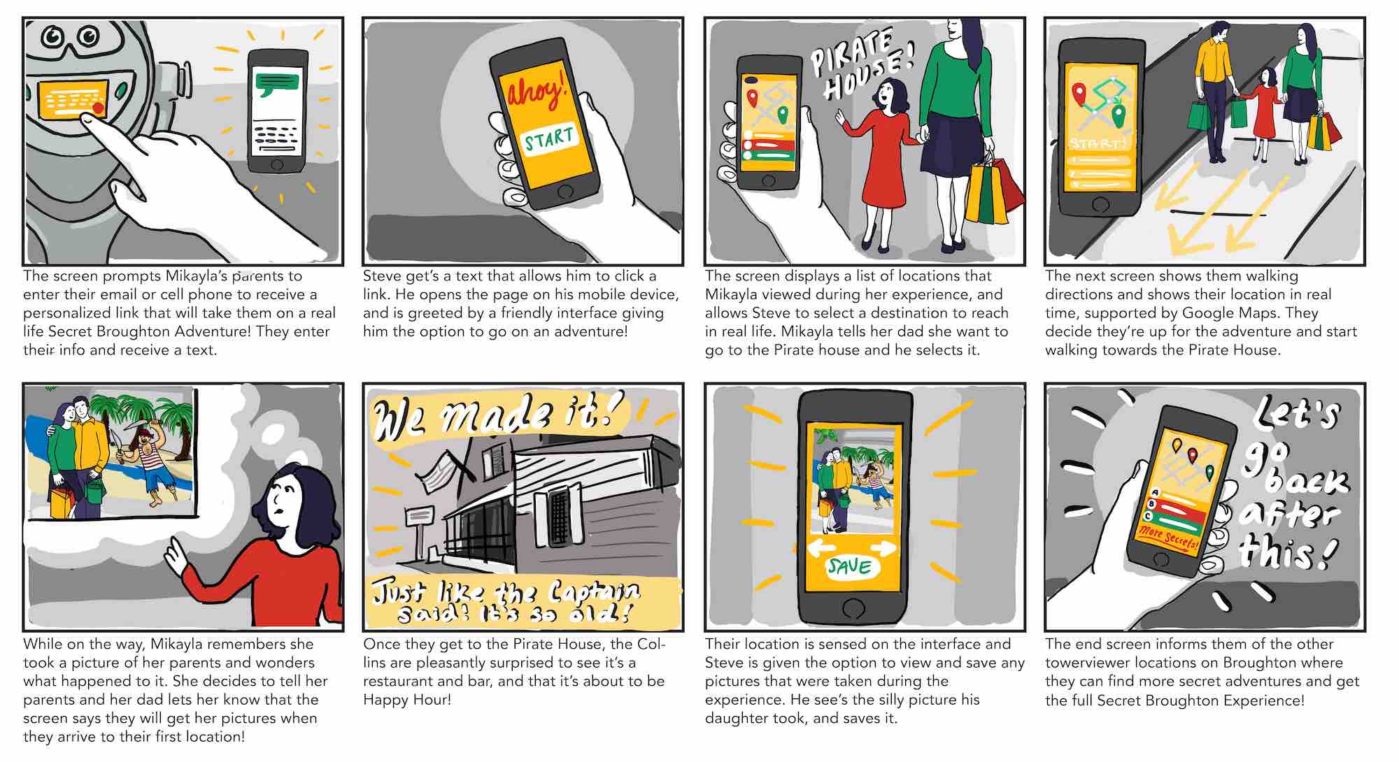 Our research pointed us in the direction of designing an interactive experience for families. As we went through the ideation process we focused on a way to create a memorable and immersive experience for both guardians and children. We wanted this experience to directly connect with the shops And sights on Broughton so we could improve foot traffic to local businesses while providing a fun thing for families to do.
