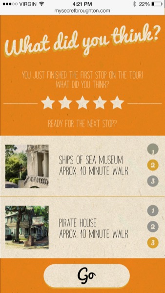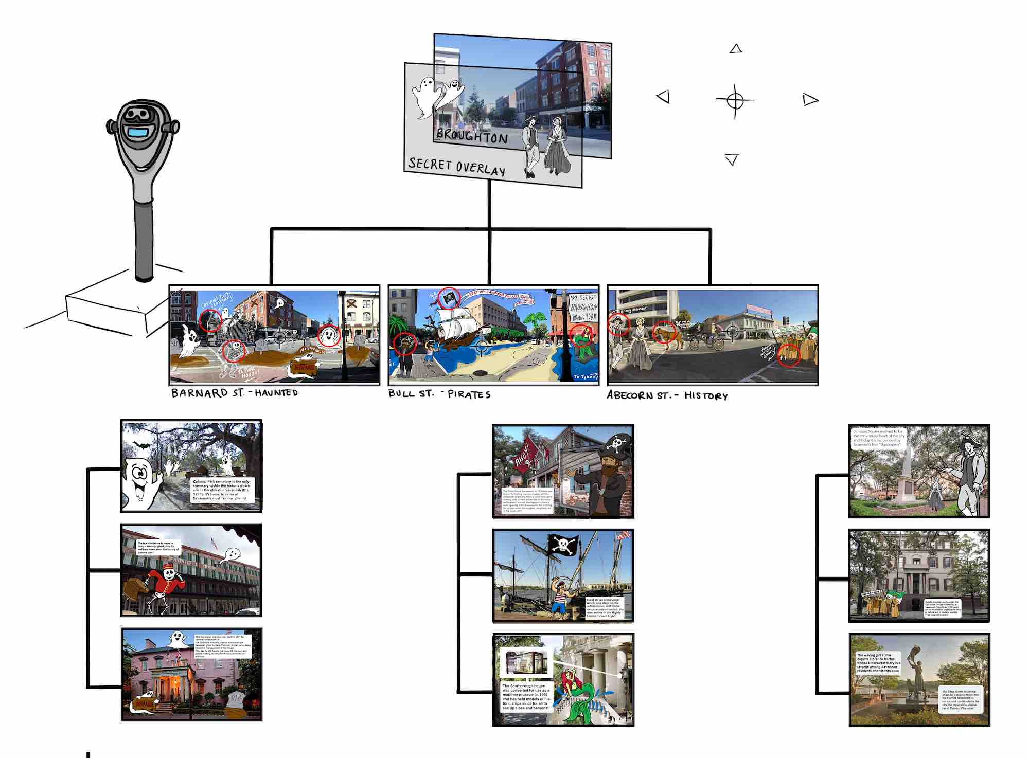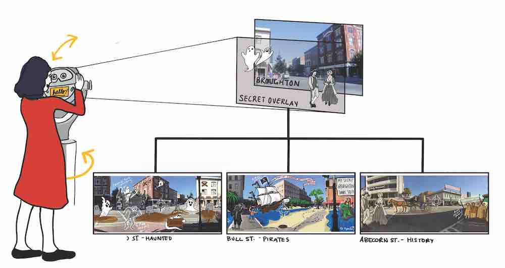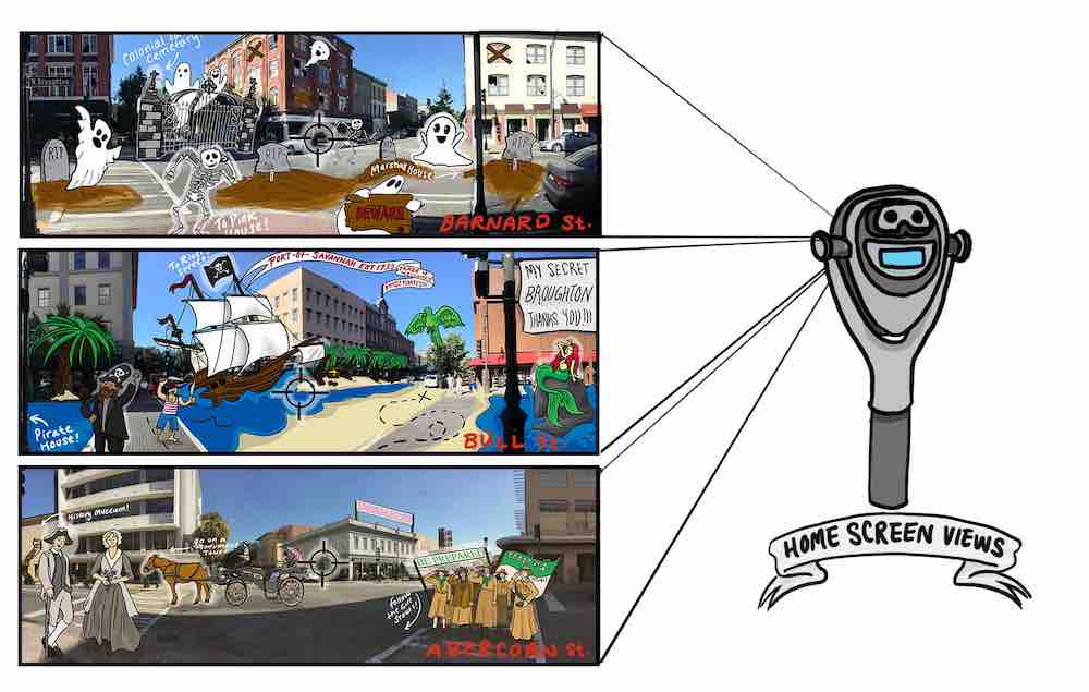 Users use the viewfinder to view an augmented view of the area they are in, overlaid with historical and fantasy images that relate to the greater stories of Savannah.